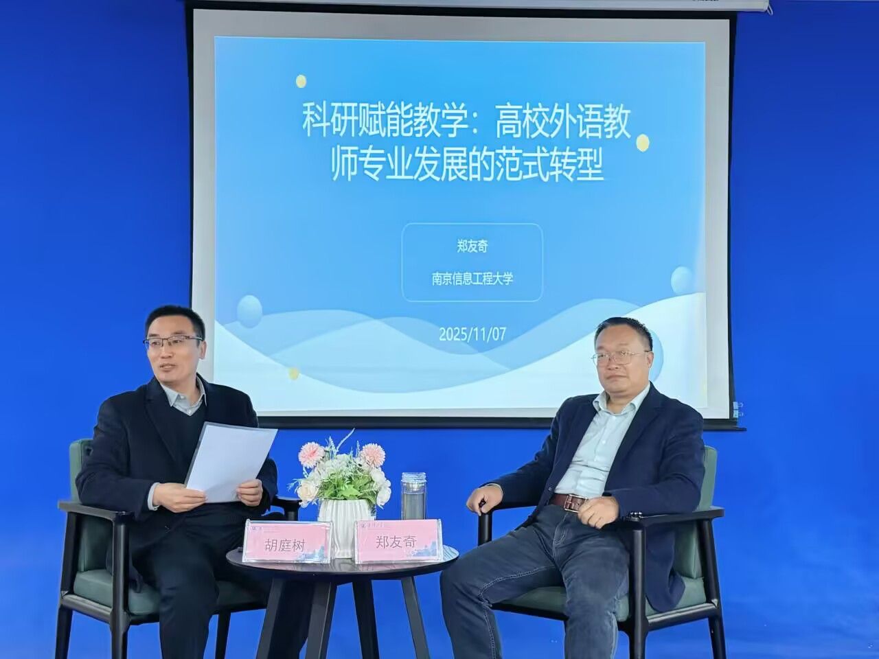 2025年11月7日下午14:30,外国语乐鱼(中国)于品学楼2号楼2102虚拟演播厅举行第三十一期“问渠”学术沙龙活动。本次学术沙龙邀请南京信息工程大学文乐鱼(中国)副院长郑友奇教授担任主讲人,外国语乐鱼(中国)院长胡庭树主持,外国语乐鱼(中国)研究所成员教师、2025级MTI研究生参加。