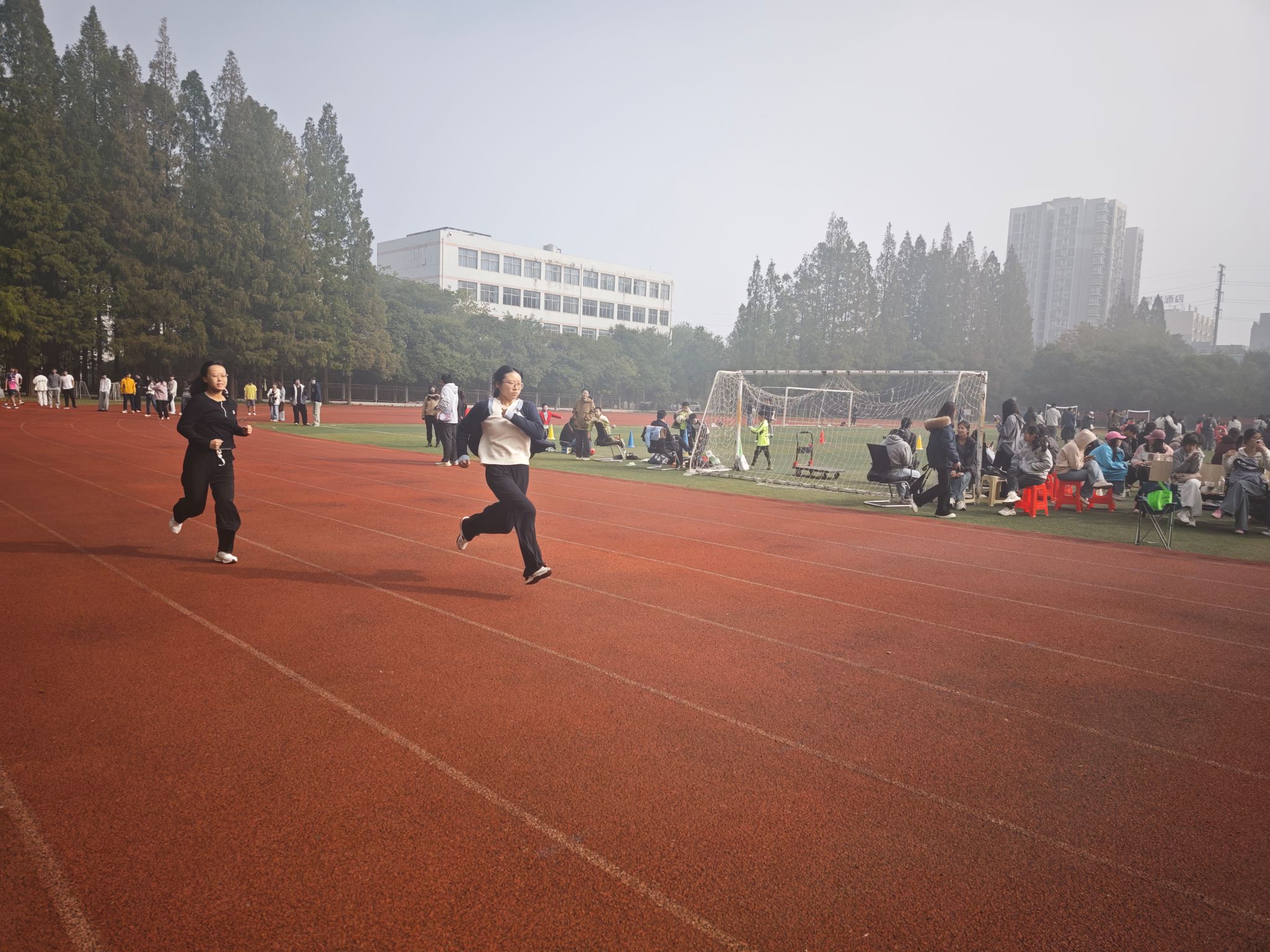 跑道上,也有一道道靓丽的身影,随着裁判员一声发令,选手们如离弦之箭,从起跑线飞奔而出。他们目光坚定,步伐矫健,拼尽全力冲向终点。当他们过了终点线的瞬间,全场响起沸腾的欢呼声。