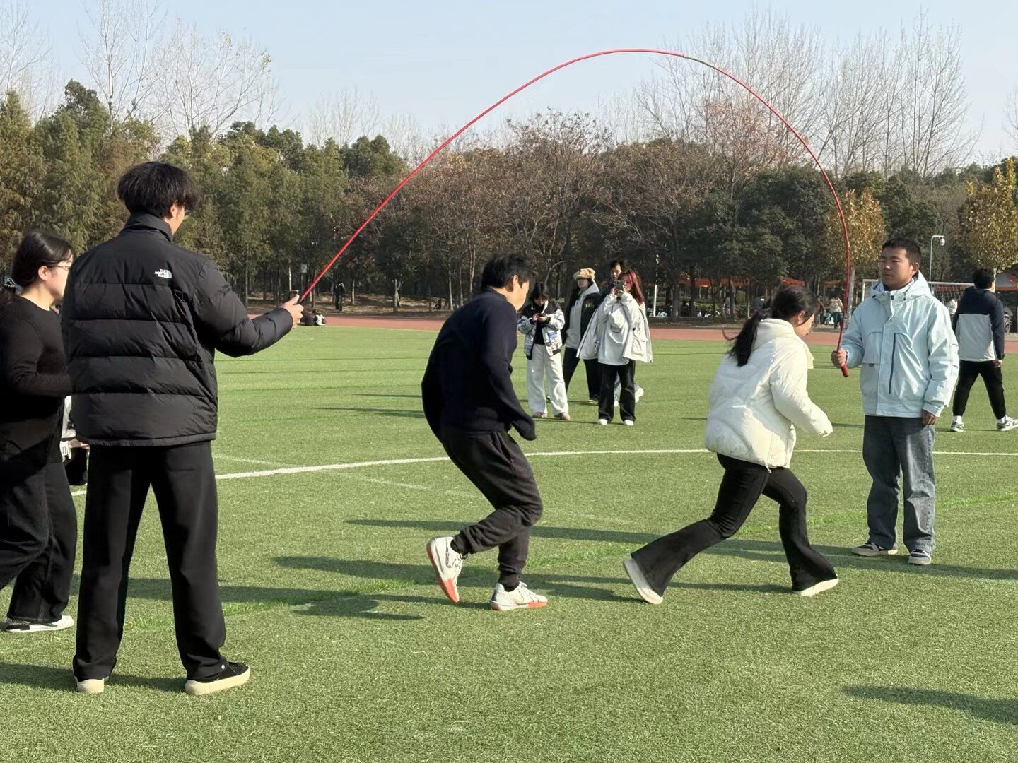 长绳如练,破风有声。各位队员们身姿矫健,依次鱼贯而入。他们随着绳影起落,在高速流转中保持完美的队形与衔接,以零失误的流畅表现,在有限时间内挑战极限次数,将团结与技巧熔铸成冬日里最动人的韵律。
